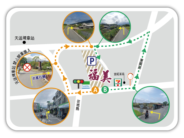 停車路線A-過全家紅綠燈巷子右轉, 約50M後右轉, 目的地即在右手邊